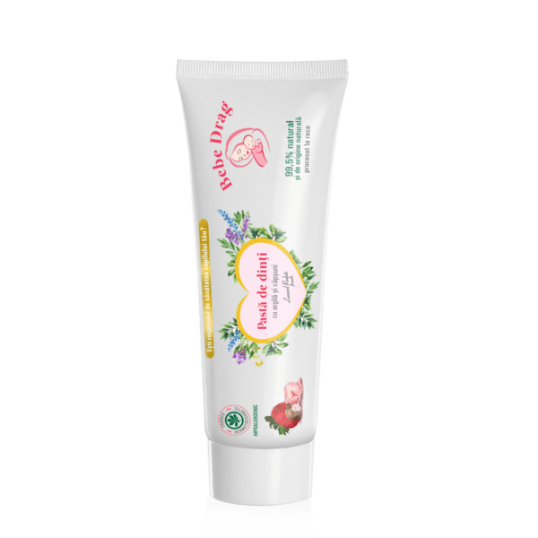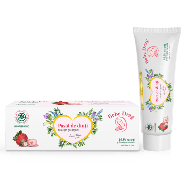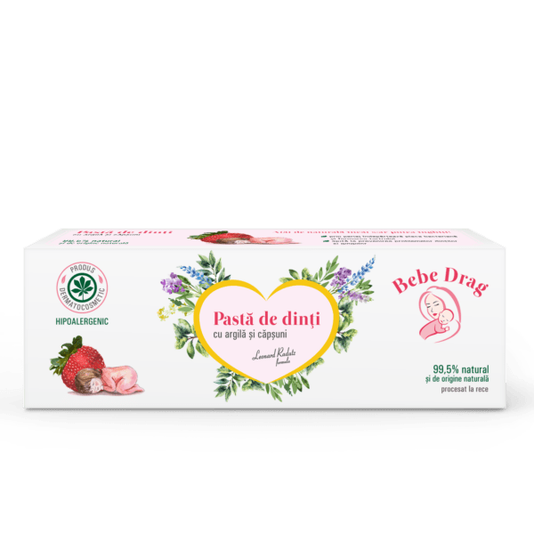 Pasta de dinţi Bebe Drag este 99,5% naturală şi de origine naturală cu aromă de capşuni. Are o formulă special concepută pentru copii, chiar şi de cele mai fragede vârste (1 an), având ca şi componente de baza argilă, aloe vera şi extracte naturale din plante. Aceste ingrediente active acţionează blând asupra dinţilor şi gingiilor celor mici şi oferă o protecţie bună împotriva dezvoltării placii bacteriene.