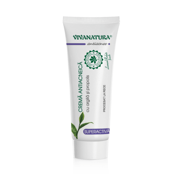 Cremă Antiacneică SUPERACTIVĂ cu argilă activă și propolis este un remediu 100% natural în tratarea acneei. Produsul este foarte eficient datorită conținutului de substanțe active din plante, uleiuri esenţiale de tea tree, argilă și propolis. Aceste ingredientele au un puternic rol antibacterian, antimicotic, antifungic, dezinfectant.