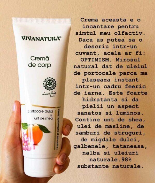 Crema de corp cu ulei de portocale și unt de shea are efect emolient, nutritiv şi hidratant. Formula sa înglobează principii active din plante, uleiuri naturale și unt de shea, care pătrund foarte repede în piele, nu lasă urme grase pe corp.