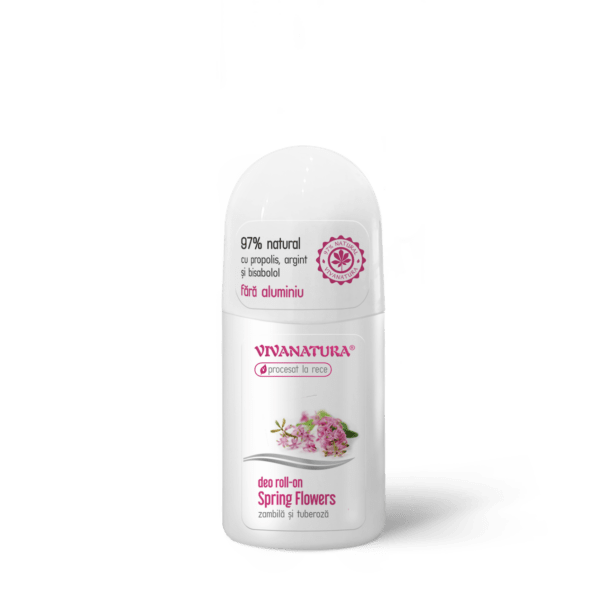 Deodorant natural roll-on Spring Flowers, 50 ml cu propolis, argint și bisabolol, fără aluminiu și procesat la rece, 97% natural