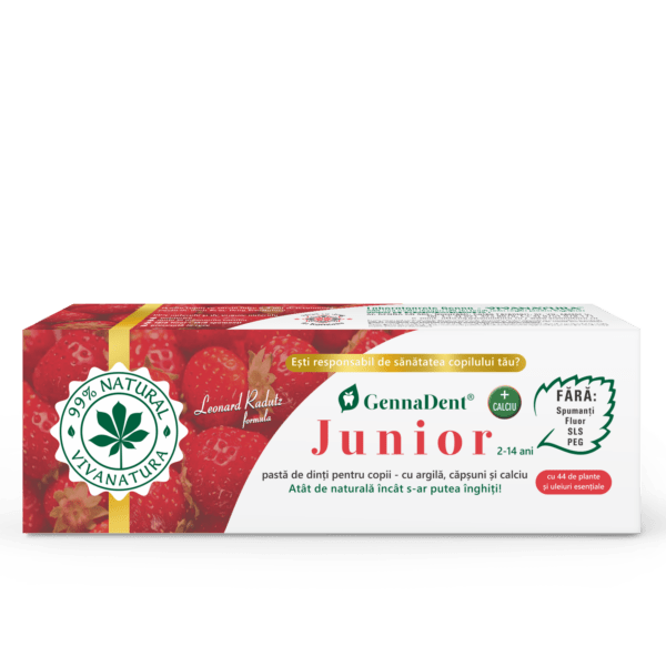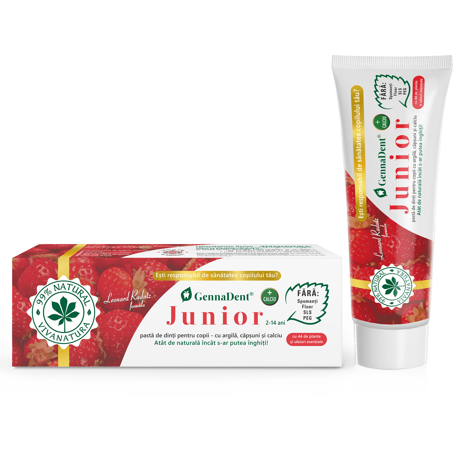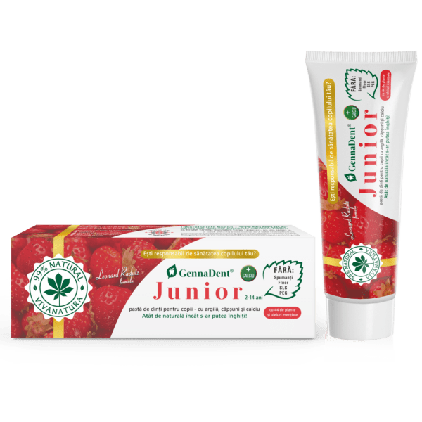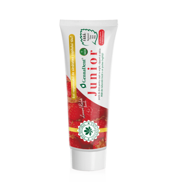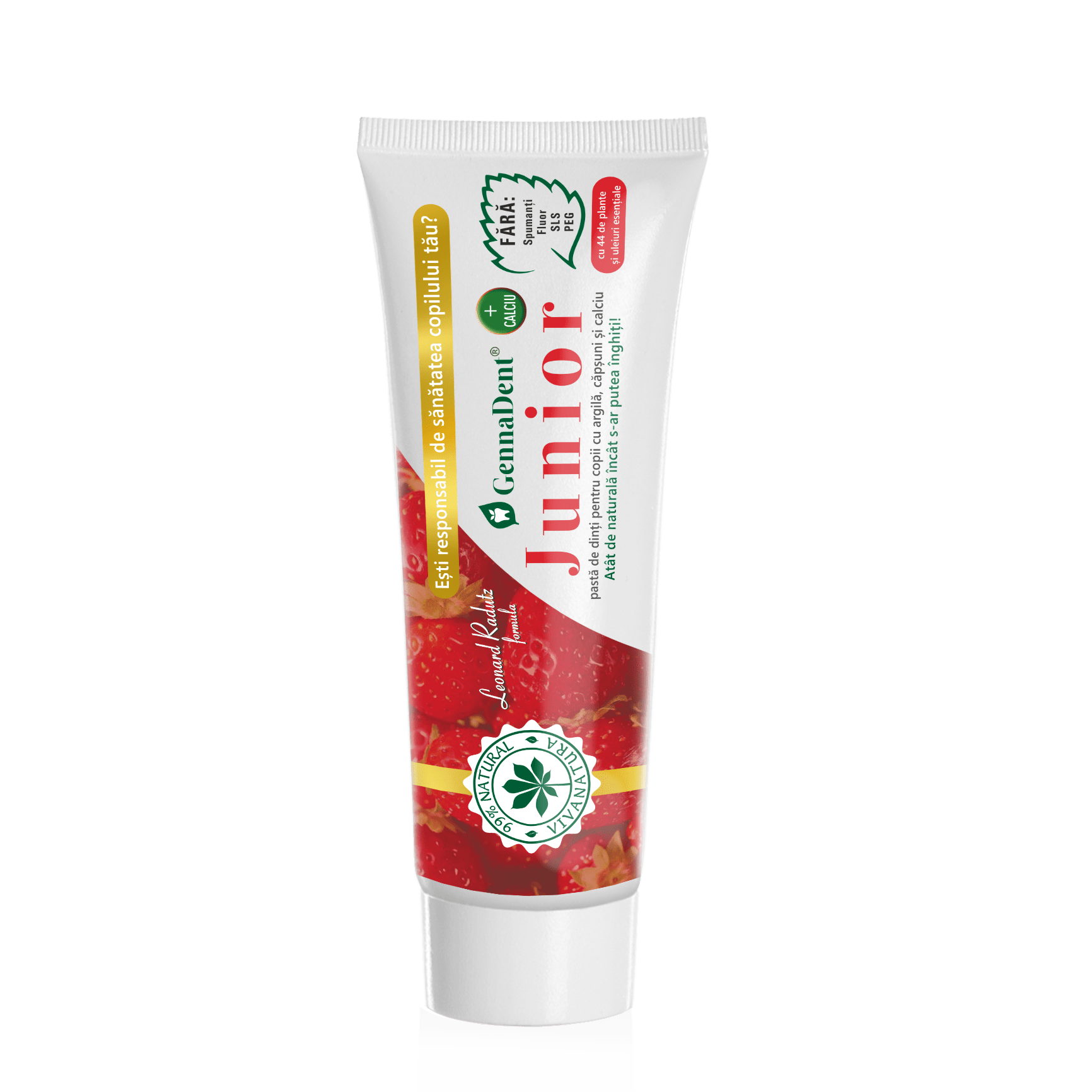 GennaDent Junior Capsuni– pasta de dinti naturală pentru copii cu argila si capsuni, fara fluor, 50 ml – Leonard Radutz formula – VivaNatura