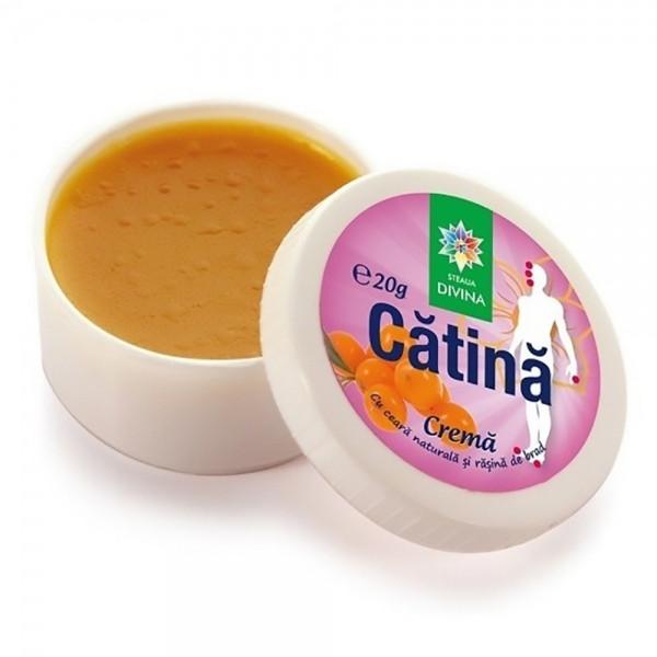 Crema de catina alba este excelenta pentru mentinerea sanatatii pielii. Compozitie: Catina (Hippophae rhamnoides), ulei de floarea-soarelui, ceara de albine, rasina de brad, ulei esential de Lavanda. Actiuni: Vitaminizant antibacterien antiseptic antibiotic filtreaza razele ultraviolete si alte radiatii cu efecte nocive asupra tenului regenerator al pielii cicatrizant si emolient Indicatii: Dermatoze micoze impetigo stafilococii ale fetei arsuri degeraturi. Uz cosmetic: ten ridat protejeaza impotriva razelor solare si a altor tipuri de radiatii imbunatateste starea tenului fiind utila pentru orice tip de ten. Contraindicatii: Alergie la oricare dintre componentele produsului. Mod de utilizare: Se realizeaza aplicatii locale de 2-3 ori pe zi la nivelul zonelor afectate. Se recomanda testarea prealabila a sensibilitatii pe o portiune mica de piele.