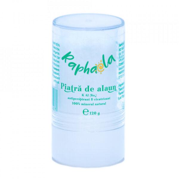 Piatra de alaun este un mineral 100% natural cu proprietati bactericide, antimicrobiene, cicatrizante si astringente. Nu contine conservanti parabeni, coloranti, parfum si nici un alt ingredient artificial. Compozitie: 100% Potassium Alum Actiuni: Antiperspirant antibacterian antimicrobian cicatrizant si astringent. Indicatii: Este foarte eficienta ca antiperspirant dar si dupa ras barbierit epilare. Contraindicatii: Nu exista contraindicatii. Mod de utilizare: Se aplica local pe piele. Se umezeste inainte de utilizare.
