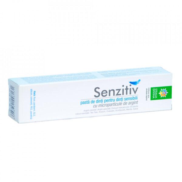 SENZITIV – pastă de dinţi pentru dinți sensibili Elimină durerile care pot apărea în timpul periajului dinţilor. Combinaţia de uleiuri esenţiale naturale îi conferă nu doar un gust delicious, ci și un efect rapid. Ingrediente : argint coloidal, argilă specială, extract hidroalcoolic din 39 de plante (Vaccinium myrtillus, Angelica archangelica, Cynara scolymus, Ocimum basilicum, Carum carvi, Satureja hortensis, Equisetum arvense, Achillea millefolium, Coriandrum sativum, Laurus nobilis, Fraxinus excelsior, Foeniculum vulgare, Calendula officinalis, Gentiana lutea, Inula helenium, Salvia sclarea, Juniperus communis, Hyssopus officinalis, Lavandula angustifolia, Rosa canina, Mentha piperita, Betula pendula, Juglans regia, Taraxacum officinale, Populus nigra, Melissa officinalis, Robinia pseudacacia, Salix alba, Salvia officinalis, Cnicus benedictus, Cinnamomum verum, Cassia angustifolia, Sambucus nigra, Origanum vulgare, Capsella bursa pastoris, Polygonum aviculare, Centaurium erythraea, Marrubium vulgare, Viscum album) , sare, uleiuri esențiale de: cuișoare, tea-tree, salvie, scorțișoară, cardamom, anason, mentă. 100% Natural Nu conţine : fluor, parabeni, silicon, parafină, PEG-uri, SLS, conservanți, coloranţi şi parfum sintetic. ℮ 100g Mod de utilizare : se aplică pe periuţa de dinţi umezită, după care se periază dinţii şi gingiile timp de 2-3 minute dimineaţa, seara şi, de preferat, după fiecare masă. Precauţii : nu sunt. Contraindicaţii : în timpul tratamentelor homeopate, alergie la oricare dintre componentele produsului. Reacţii adverse : nu se cunosc. A nu se lăsa la îndemâna şi la vederea copiilor mici. A se folosi preferabil înainte de data: vezi pe ambalaj, dar nu mai târziu de 12 luni de la deschidere. A se păstra tubul bine închis, ferit de expunerea directă la razele solare.