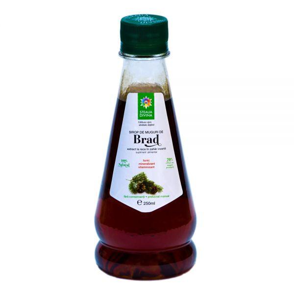 Mugurii de Brad conțin cantități mari de uleiuri eterice, vitamina C, contribuind la efectul de crestere a rezistentei la imbolnavire, elemente minerale (săruri de potasiu, calciu, fosfor, sodiu) și taninuri. Acest sirop este un excelent tonic hrănitor, mineralizant si vitaminizant și are proprietati antiseptice, antitusive si tonice asupra plamanilor si cailor respiratorii. De asemenea au un efect diuretic bland si ajuta in cazul infectiilor urinare recidivante sau al litiazei urinare. Actiuni : Astringent, cicatrizant, antibiotic, stimuleaza secretiile fiind folosit ca expectorant. Calmeaza durerile, are efect racoritor, revulsiv, cicatrizant, repermeabilizant vascular, vitaminizat, diuretic, antireumatic. Indicatii : Se recomanda ca adjuvant in: raceli, tuse, faringite, bronsite, infectii urinare si respiratorii repetate, astenie, oboseala, stari de stres, lipsa poftei de mancare. Ingrediente: extract la rece din muguri proaspeți de Brad ( Abies alba ) – 70%, zahăr invertit, apă deionizată. Mod de utilizare: câte 3 lingurițe de sirop la un pahar cu apă de 3 ori pe zi sau la recomandarea consultantului de specialitate. În timpul utilizării produsului este necesar consumul sporit de lichide! Precauţii la utilizare: nu sunt, la dozele recomandate. Contraindicaţii : diabet zaharat, alergie la oricare dintre componente. Reacţii adverse: nu s-au semnalat. Dacă apar manifestări neplăcute, adresaţi-vă medicului sau farmacistului. Interacţiuni medicamentoase: nu se cunosc Produsul nu conține ingrediente cu potențial alergenic . UZ INTERN Produsul este un supliment alimentar şi nu trebuie să înlocuiască o dietă variată şi echilibrată şi un mod de viaţă sănătos. Produsul poate conține particule în suspensie care nu reprezintă defecte de calitate. A se agita înainte de utilizare. A se păstra la temperatura camerei, ferit de lumină. A nu se depăşi doza recomandată pentru consumul zilnic. A nu se lăsa la îndemâna şi la vederea copiilor mici. A se consuma de preferinţă înainte de sfârșitul: vezi pe ambalaj.