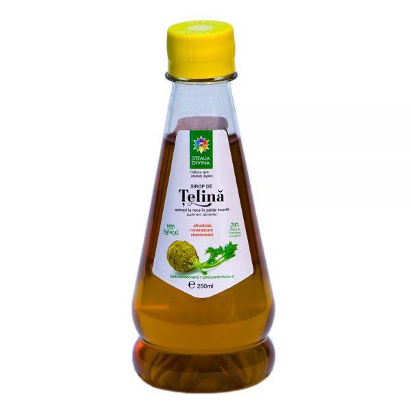 Telina contine vitaminele D, C, E, B1, B2, B3 si substante minerale Na, Ca, P, Fe, Mg, Mn, Cu. Este hranitoare, mineralizanta, vitaminizantă, tonică a sistemului nervos si binecunoscuta pentru efectul sau afrodiziac. Actiuni : Tonic al sistemului nervos vitaminizant tonic afrodiziac diuretic depurativ. Indicatii : Tonifica sistemului nervos eficient in perioadele de efort intelectual prelungit examene de asemenea in perioadele de refacere dupa efort fizic si intelectual prelungit surmenaj stres aduce organismului un bogat aport de vitamine: C A E B1 B2 B3 si substante minerale: Na Ca P Fe Mg Mn Cu dinamizeaza potentialul sexual fiind recomandat in caz de astenie sexuala. Este racoritor si ajuta la eliminarea apei din organism. Este recomandat persoanelor care se confrunta cu stari de stres si oboseala. Ingrediente: extract la rece din rădăcini proaspete de Țelină ( Apium graveolens ) – 70%, zahăr invertit, apă deionizată. Mod de utilizare: câte 3 lingurițe de sirop la un pahar cu apă de 3 ori pe zi sau la recomandarea consultantului de specialitate. În timpul utilizării produsului este necesar consumul sporit de lichide! Precauţii la utilizare: nu sunt, la dozele recomandate. Contraindicaţii : diabet zaharat, alergie la oricare dintre componente. Reacţii adverse: nu s-au semnalat. Dacă apar manifestări neplăcute, adresaţi-vă medicului sau farmacistului. Interacţiuni medicamentoase: nu se cunosc Produsul nu conține ingrediente cu potențial alergenic . UZ INTERN Produsul este un supliment alimentar şi nu trebuie să înlocuiască o dietă variată şi echilibrată şi un mod de viaţă sănătos. Produsul poate conține particule în suspensie care nu reprezintă defecte de calitate. A se agita înainte de utilizare. A se păstra la temperatura camerei, ferit de lumină. A nu se depăşi doza recomandată pentru consumul zilnic. A nu se lăsa la îndemâna şi la vederea copiilor mici.